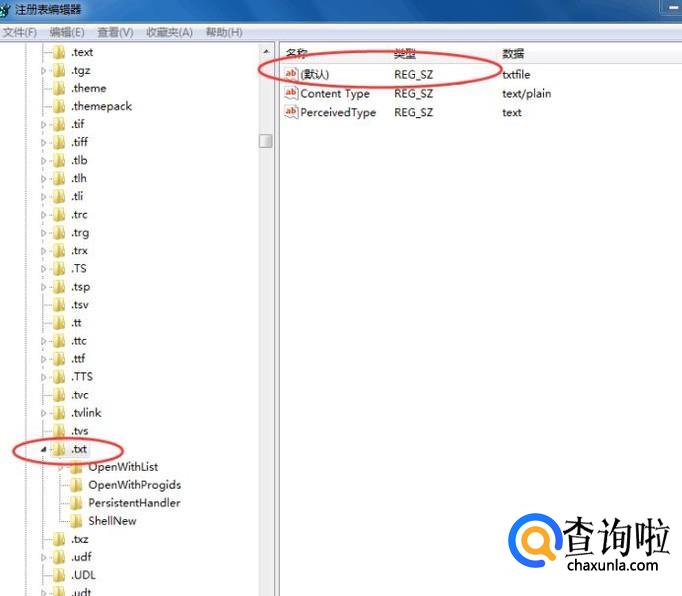 选择右侧的【默认】选项,双击打开它,然后将值改为【txtfile】即可,如下图所示: