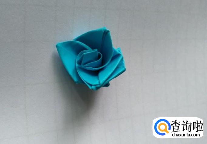 翻过折纸,用左手捏住底部,然后用右手捏住折纸上面的尖角旋转,玫瑰花就折好了。