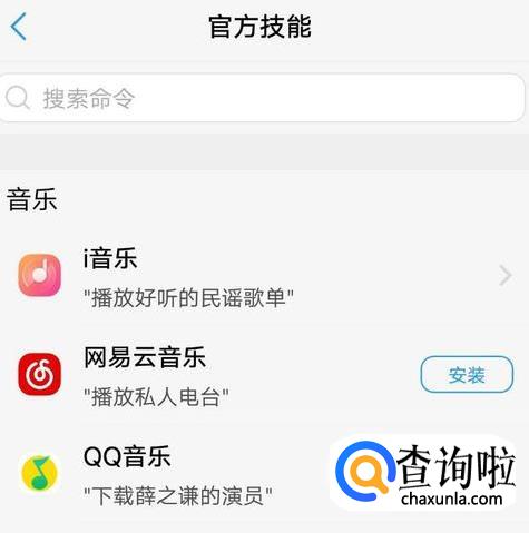 第一个【官方技能】,在这个里面有【音乐】、【社交】、【电台】等不同的分类,我们可以用语音的方式对需要下载的东西进行下载,这是系统会根据你的要求,自动跳转到该页面进行操作哦。