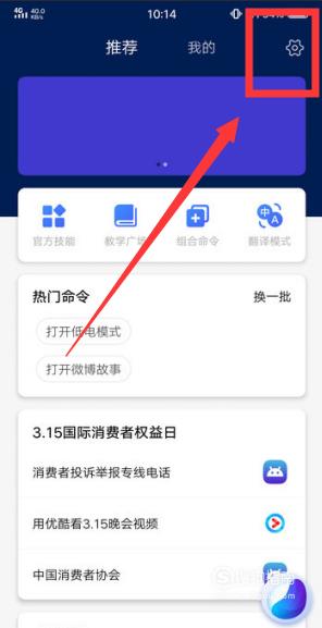 首先在手机上面找到【jovi人工智能助手】,点击【设置】,点击进入后,在该页面就是【推荐】页面啦,里面有【官方技能】、【教学广场】、【组合命令】和【翻译模式】四个选项哦,另外还有一个【我的】的页面哦。