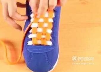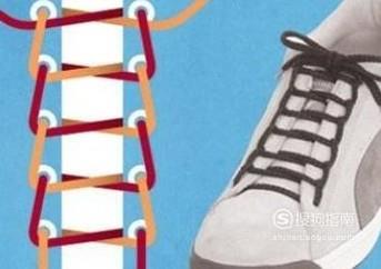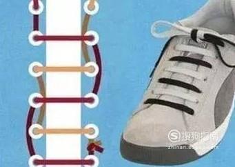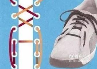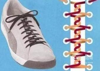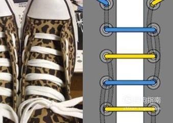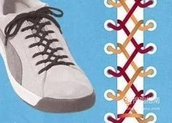 将两条不同颜色的鞋带准备好,一端在内侧打结,另一端按照以往的方法来穿,之后跳一个孔穿进去,另一条鞋带用同样的方法来穿,使其呈现出十字交叉的形状即可,适用于鞋带比较长的球鞋。