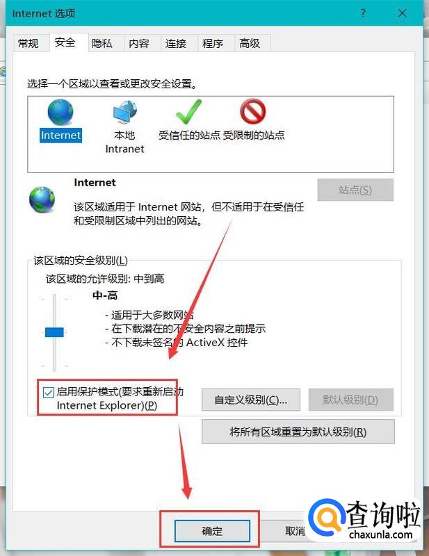 在“安全”下面点选“启用保护模式”,然后点击确定按钮,重启浏览器,该功能就会生效。