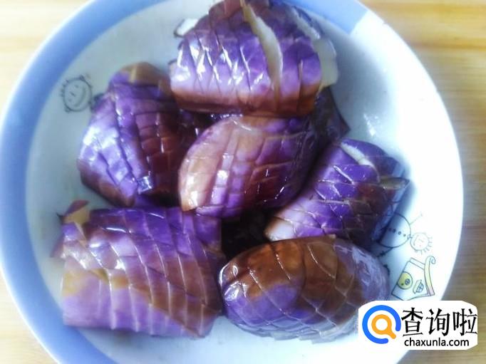 把切好的茄瓜放盘子加适量盐用水泡几分钟,然后捞上篮子沥干水份。
