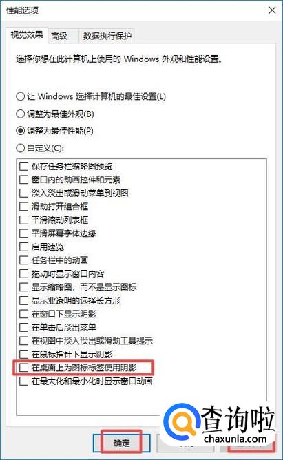 之后我们将在桌面上为图标标签使用阴影的勾选给取消掉,然后点击应用,之后点击确定,这样我们就解决这个问题了。
