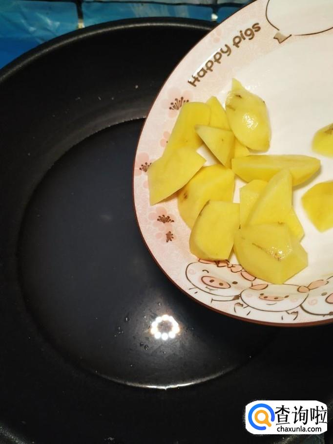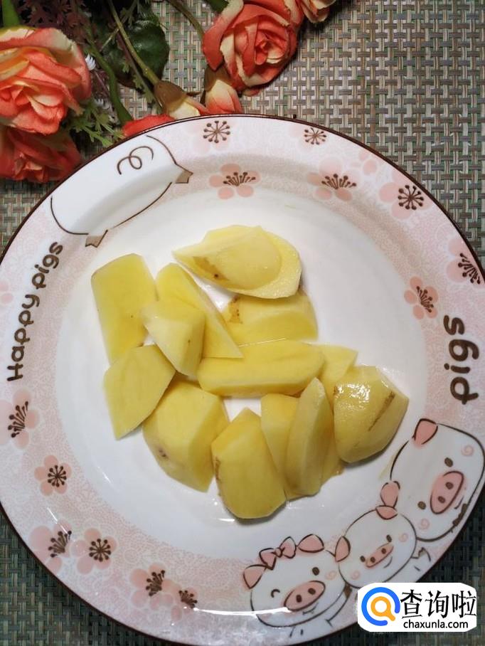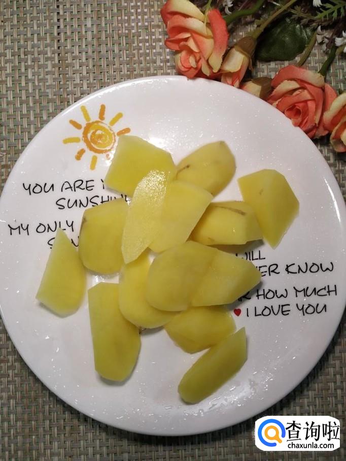 准备适量土豆,洗净后去除外皮,切成滚刀块,洗去淀粉,放入盘中备用。