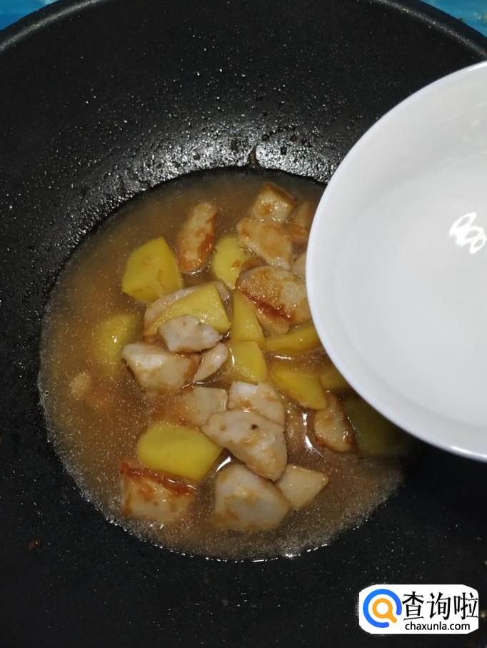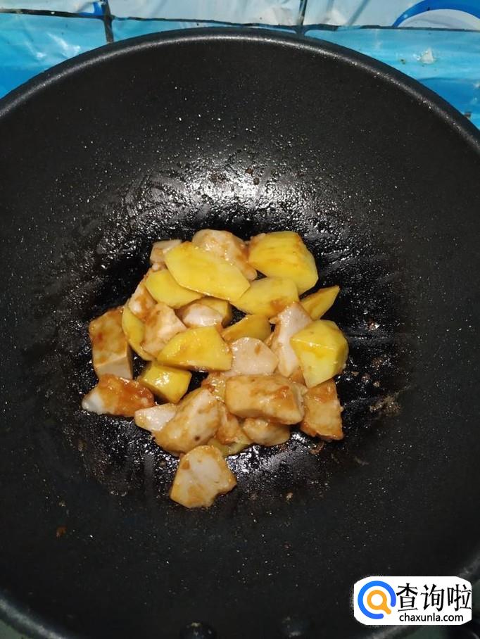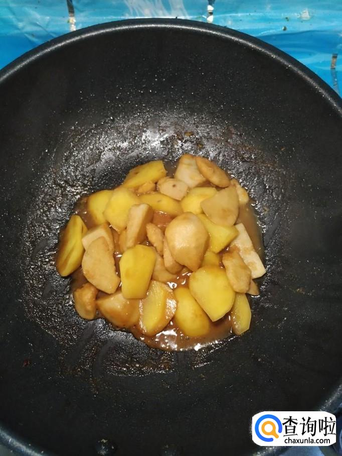 将土豆块也放入锅中和芋头一起翻炒,很快芋头和土豆都均匀的粘上一层糖色。再加入少半碗清水,大火将水烧开。