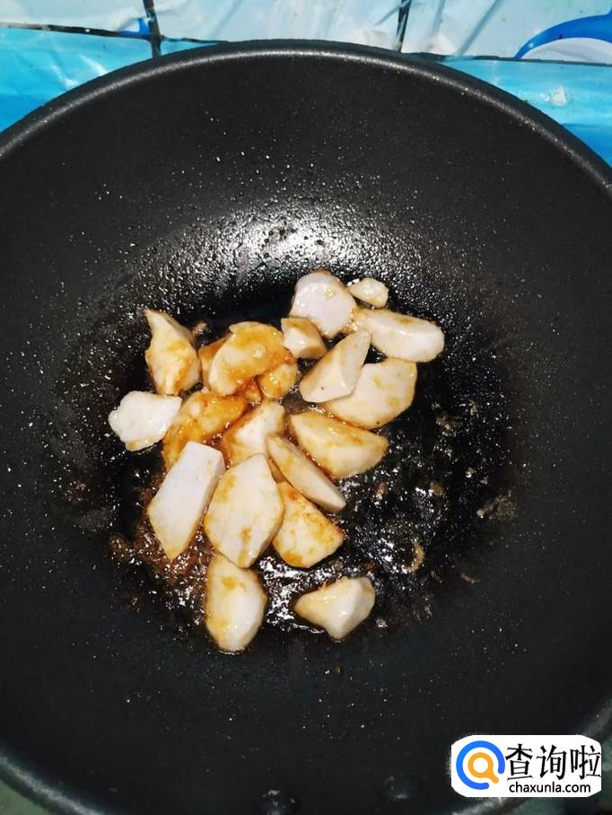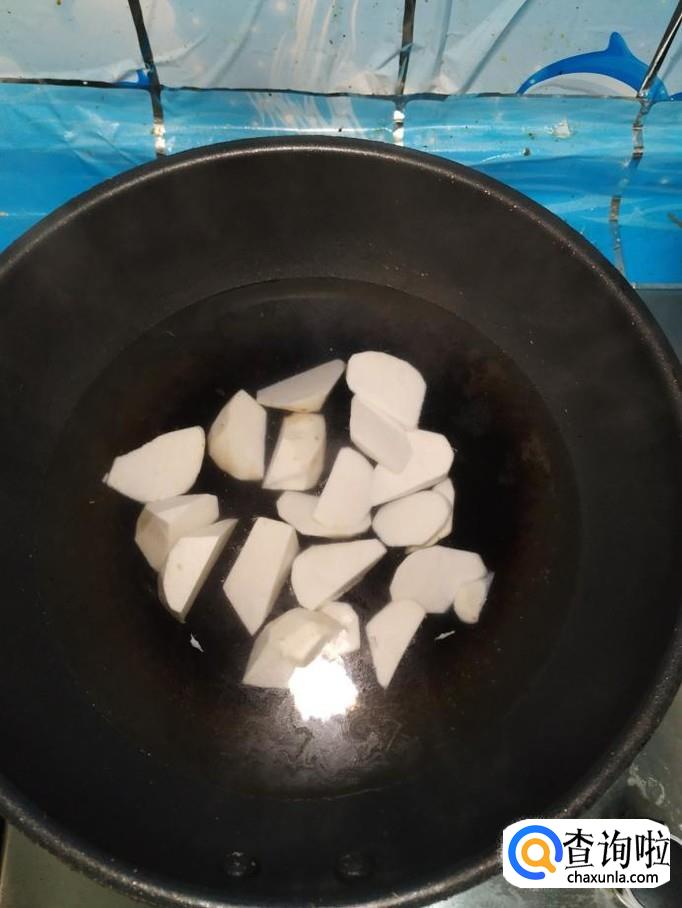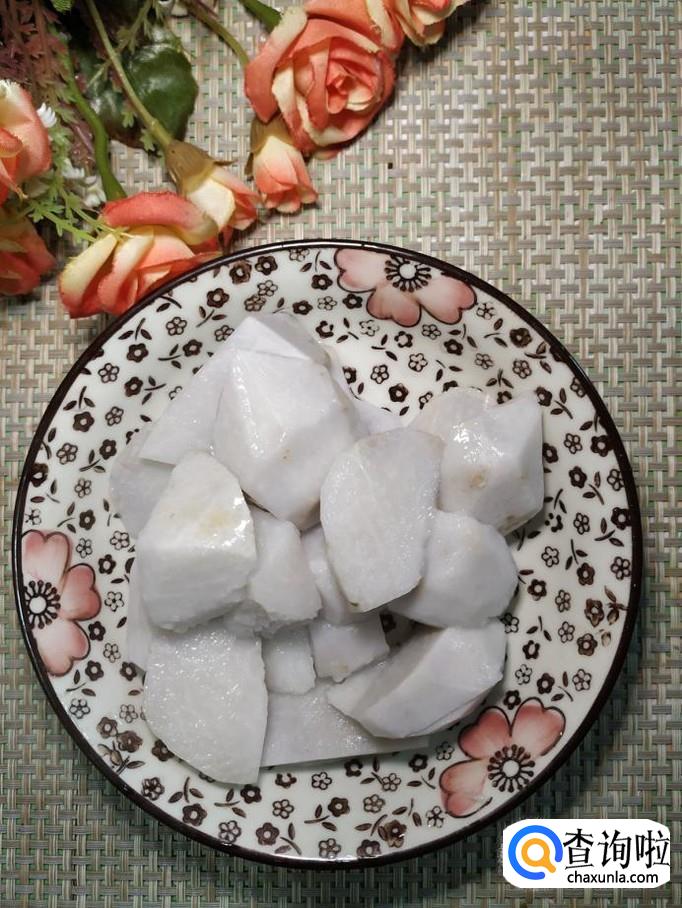 准备适量芋头,削去外皮,切成滚刀块,注意,在处理的过程要保护好手部,芋头的粘液一旦接触好手部,会刺激皮肤发痒。