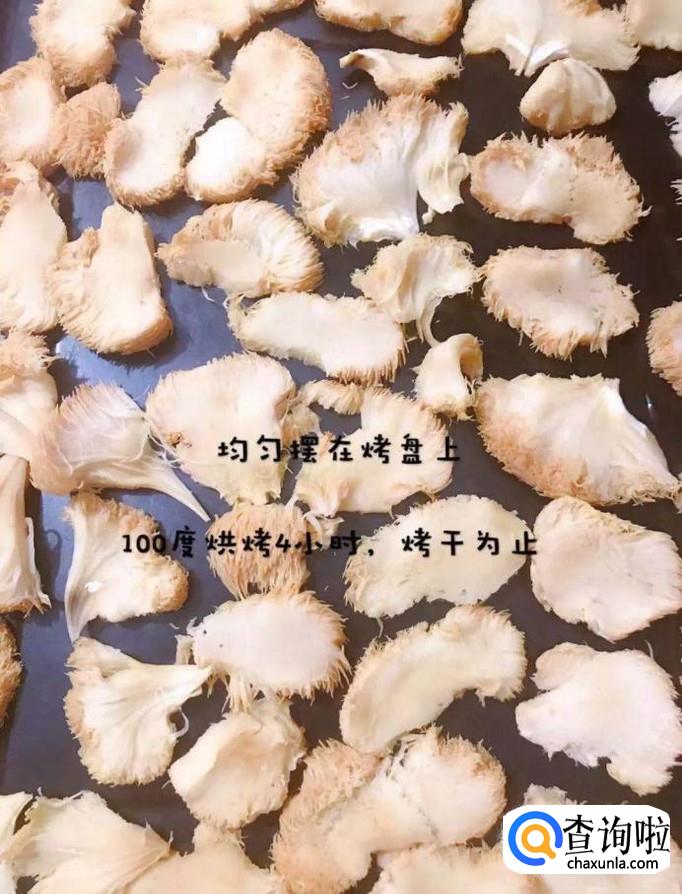 然后将猴头菇片均匀的摆在烤盘上,放进烤箱上下100°火烤四个小时,如下图所示。