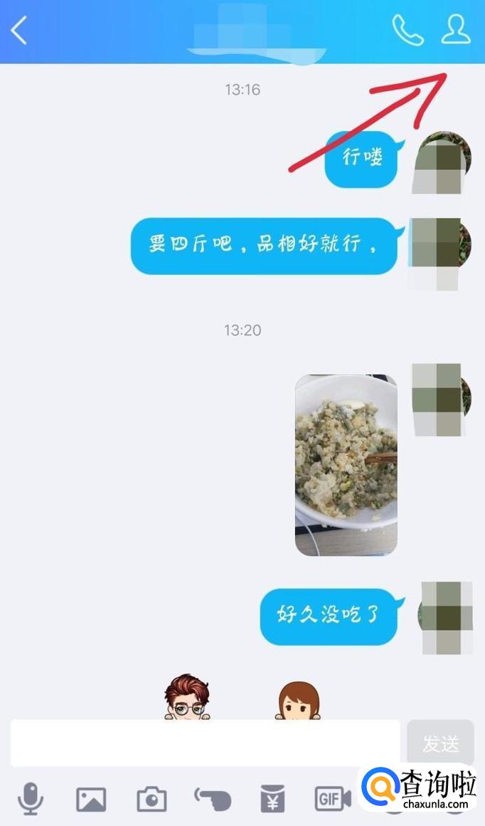 打开想要查找聊天记录的扣扣聊天界面,点击右上角的小人,如下图所示。