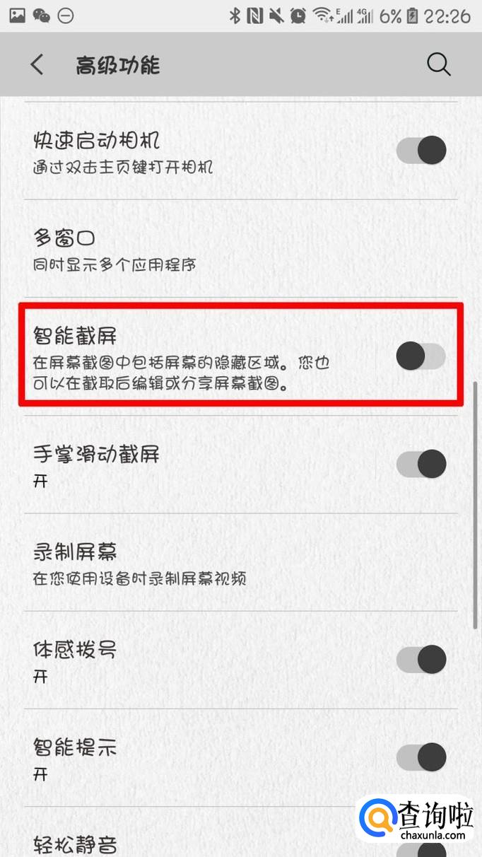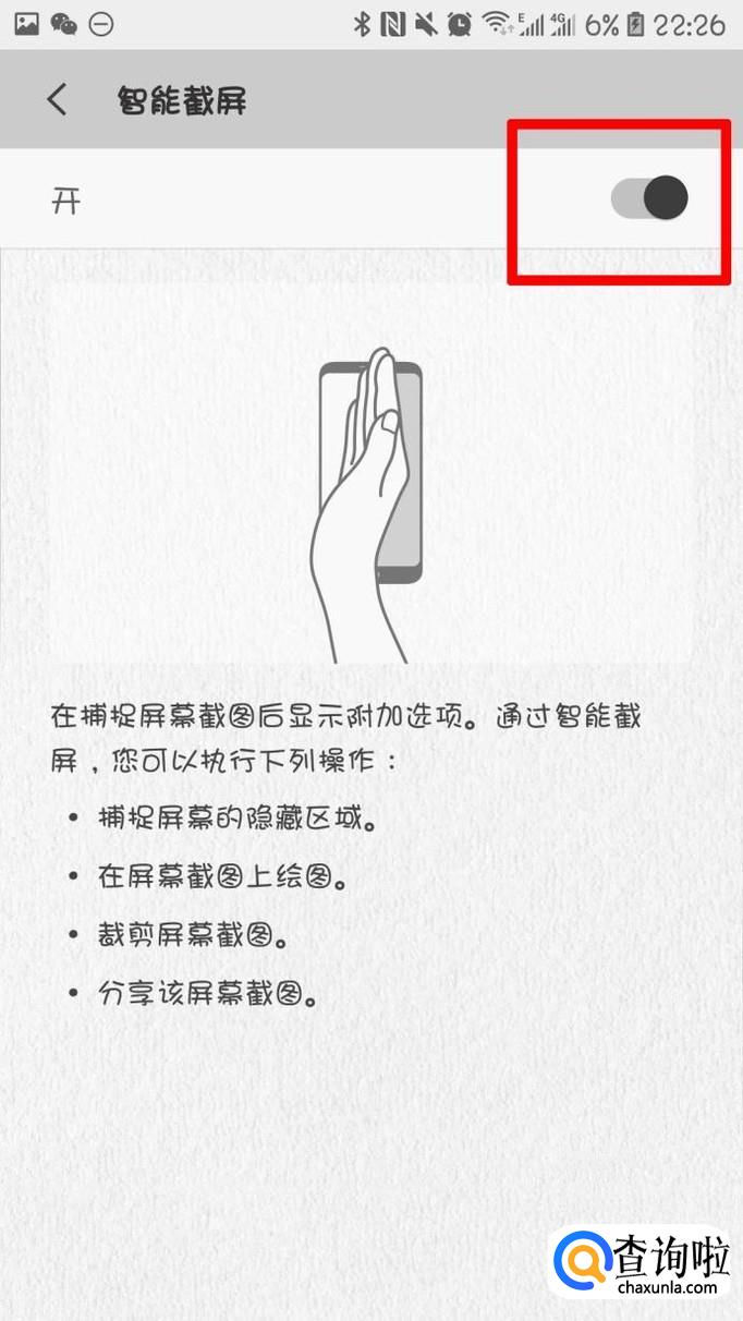 来到下一个页面,我们滑动开关打开智能截屏