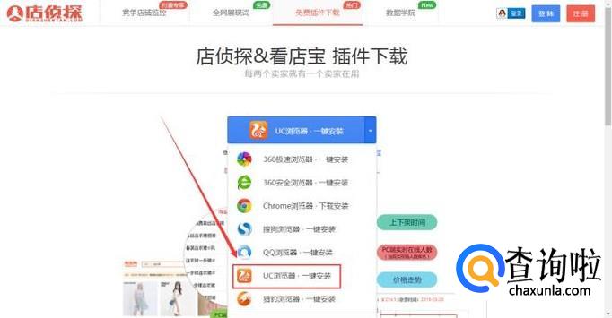 点击进入官网,首页位置就能把店侦探插件一键安装到浏览器中,我用的是UC浏览器,就在列表中选择的是“UC浏览器 一键安装”。