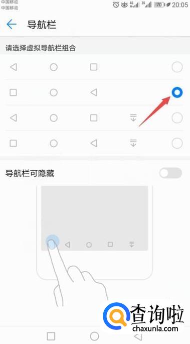 弹出的界面,我们可以看到系统默认的返回键是在左边的,选择喜欢的哪一个,这里我们可以点击第二个选项。下方导航栏可隐藏这里,点击一下把开关打开。