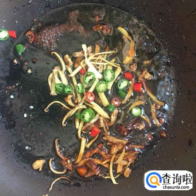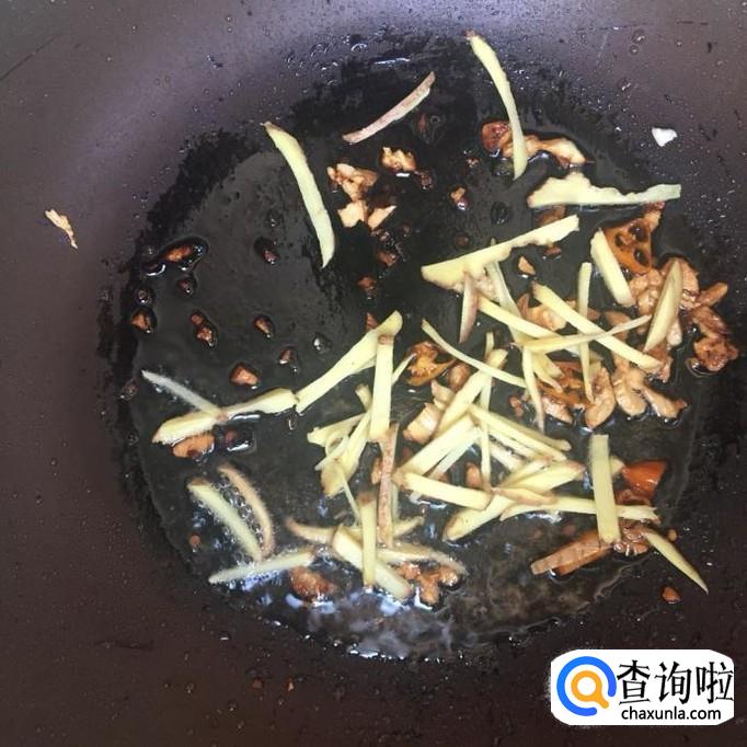 然后往锅中加入适量的食用油,待油冒烟,倒入蒜蓉、黄辣椒、姜丝爆香,如下图所示。