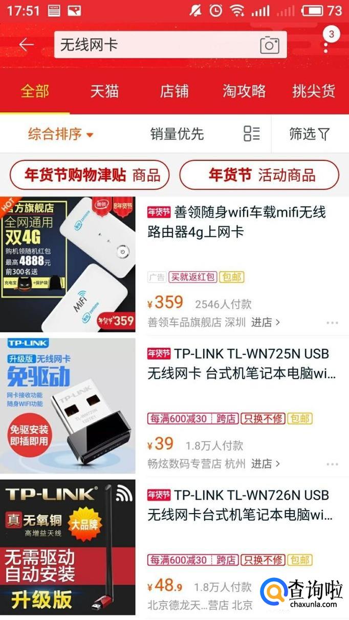 在淘宝上也可以购买无线网卡,并且价格相对较低性价比较高。