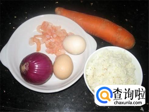 炒米饭一碗,鸡蛋两个,胡萝卜半根,虾仁一把,葱花适当,洋葱一小块。胡萝卜写成丁,洋葱切丁,虾仁清洗干净,鸡蛋打散。