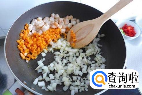 锅里再加一点点食用油,烧热之后炒虾仁。虾仁炒变色之后加入洋葱丁和胡萝卜丁,炒熟之后放上葱花翻炒几下。