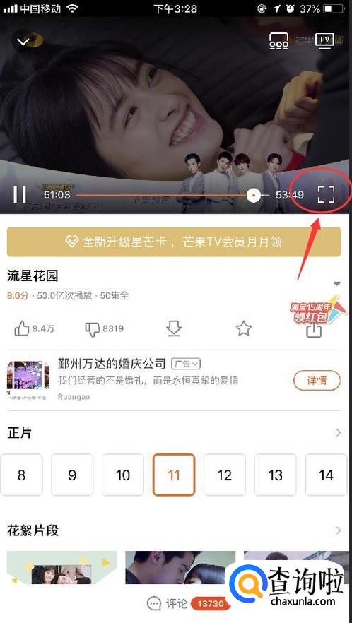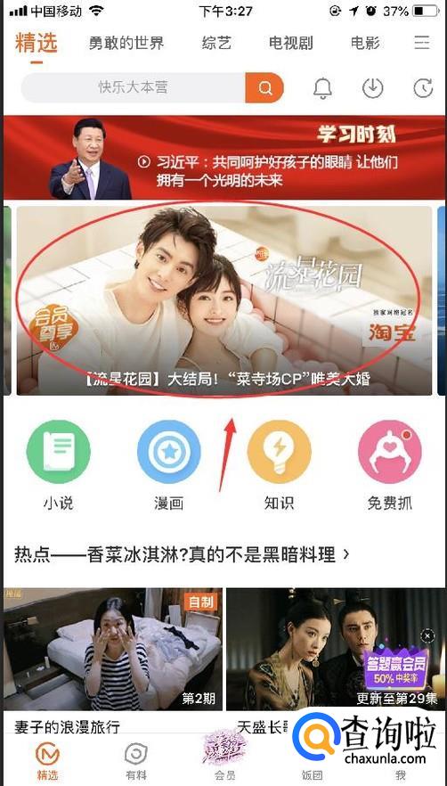 首先,在手机上打开芒果tv的APP,点进去,如图进入首页,选一个视频点进去(随意选想看什么视频,我选的是流星花园)