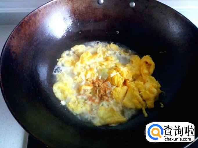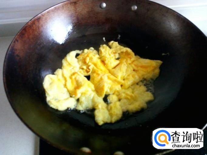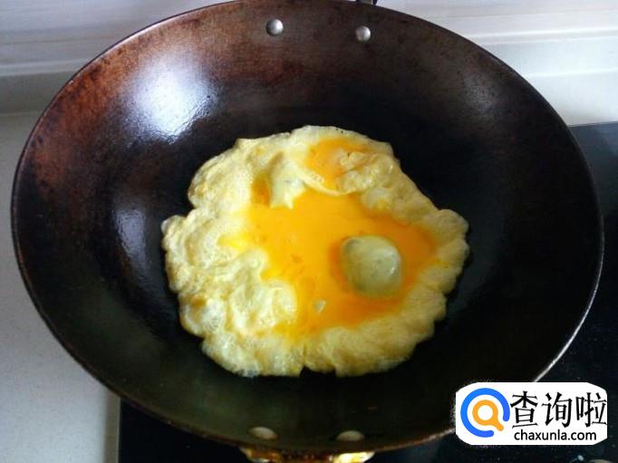 锅放油加热,油热后放入鸡蛋煎塌,用铲刀把煎塌的鸡蛋铲成块。