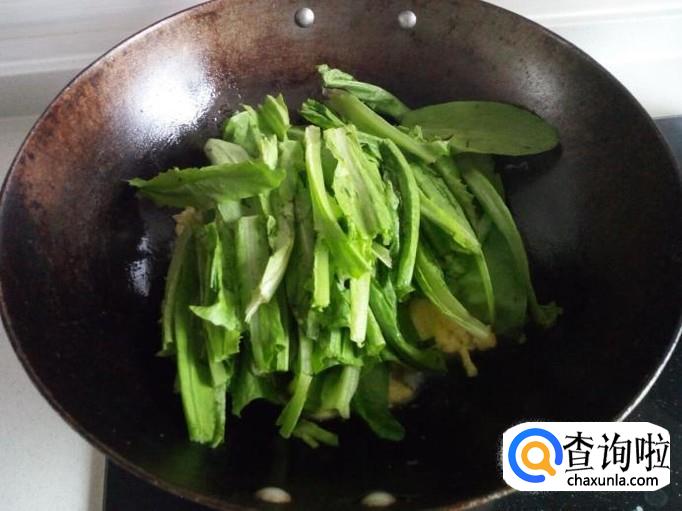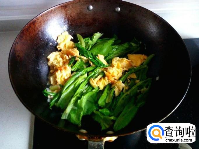 然后把油麦菜放入锅中,把煎好的鸡蛋,用铲刀翻至上面,让油麦菜浸入汤中略烧一下。适当翻面。