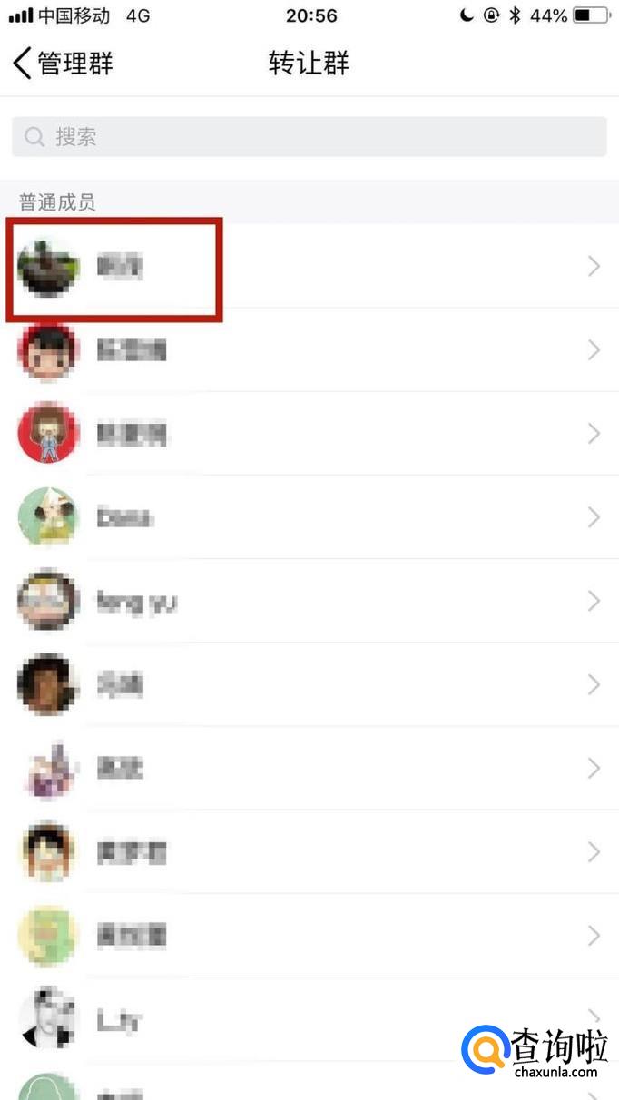 然后点击一个要转让群主的群成员,如下图所示。