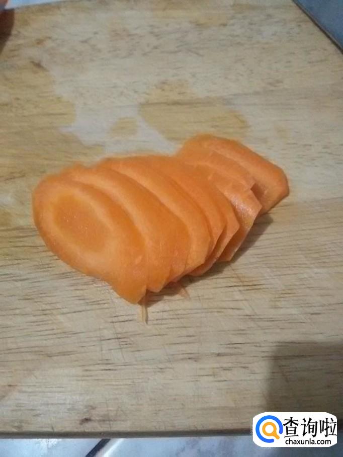 切胡萝卜片时,斜着下刀,每一刀的距离要一致,这样切出的胡萝卜片是椭圆的,而且薄厚一样。