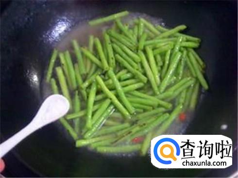 炒豇豆的时候,加上一点水,然后开着锅盖炒,等到水干了之后再加上一点,这样反复三次,豇豆就会熟透且颜色依旧漂亮。