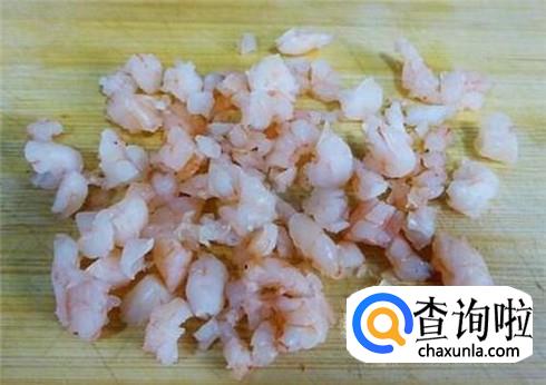 把买回来新鲜的虾,去掉虾头和虾线,剥开壳,然后把虾肉切碎。