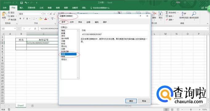 唤出"设置单元格格式"对话框,选择"数字→文本"。如图所示,再完整输入身份证号完成实验。
