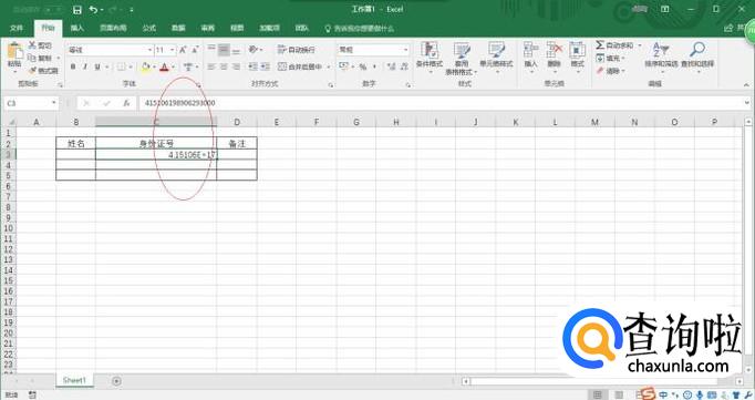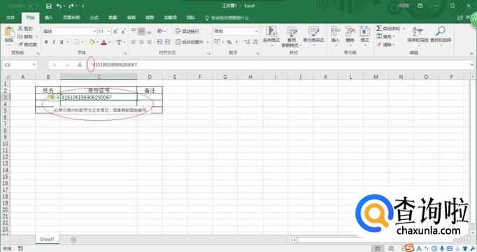 单元格输入员工身份证号"415106198906293067",如图显示"4.15106E+17"。而编辑栏显示最后3位数变成0,这些显然不符合格式要求。