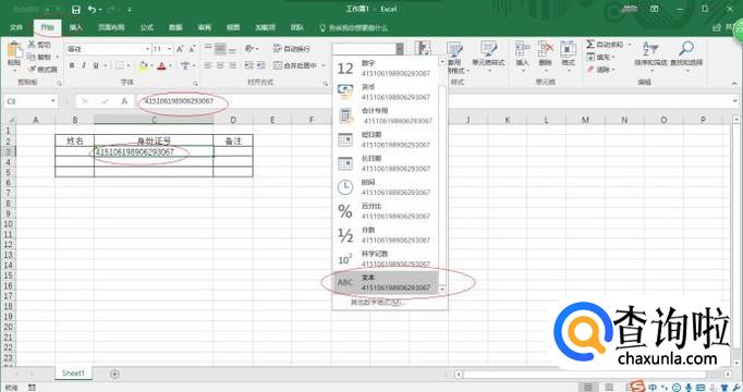 点击"开始→数字→常规"下拉列表框,选择"文本"项。在单元格即可完整输入身份证号,如图所示。