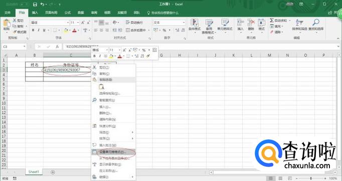 选中需输入身份证号的单元格,如图所示。点击鼠标右键,选择"设置单元格格式"项。