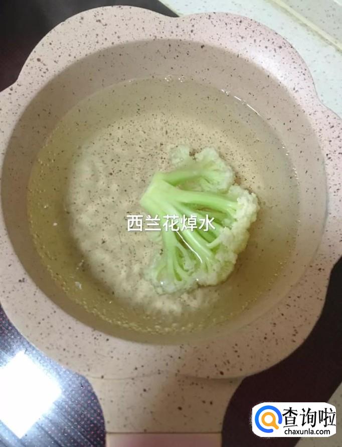锅中放入适量的清水,待水烧开,把菜花丢进去烫两分钟,捞出控干,如下图所示。