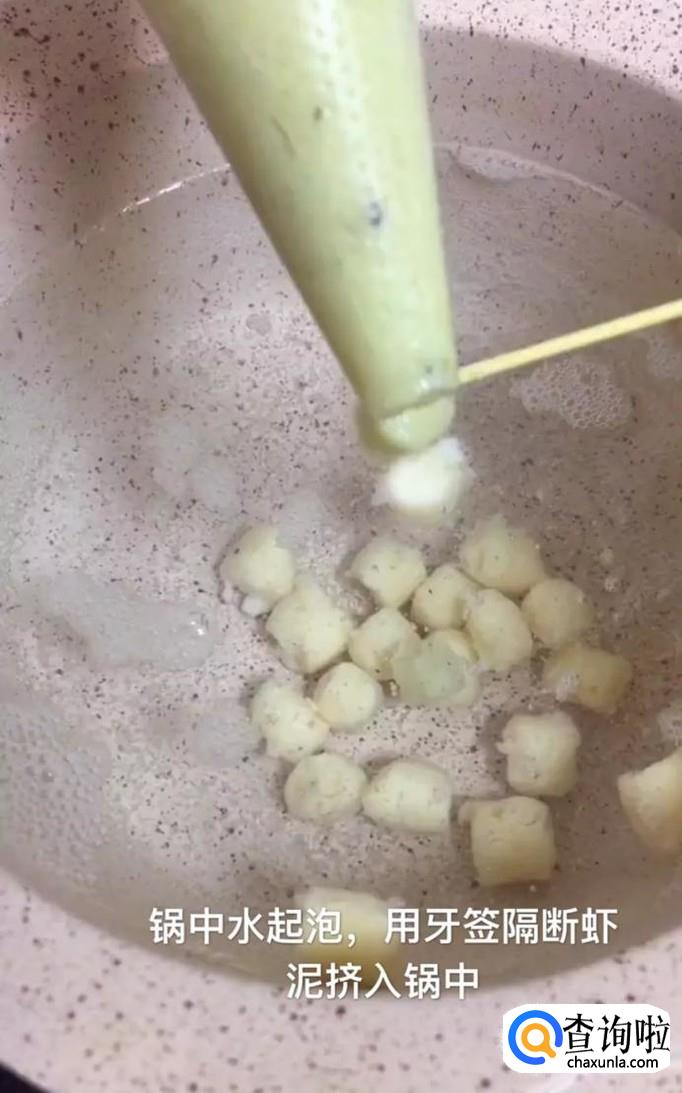 然后锅中放入适量的水,待水烧开,用牙签隔断虾泥,给入锅中,如下图所示。