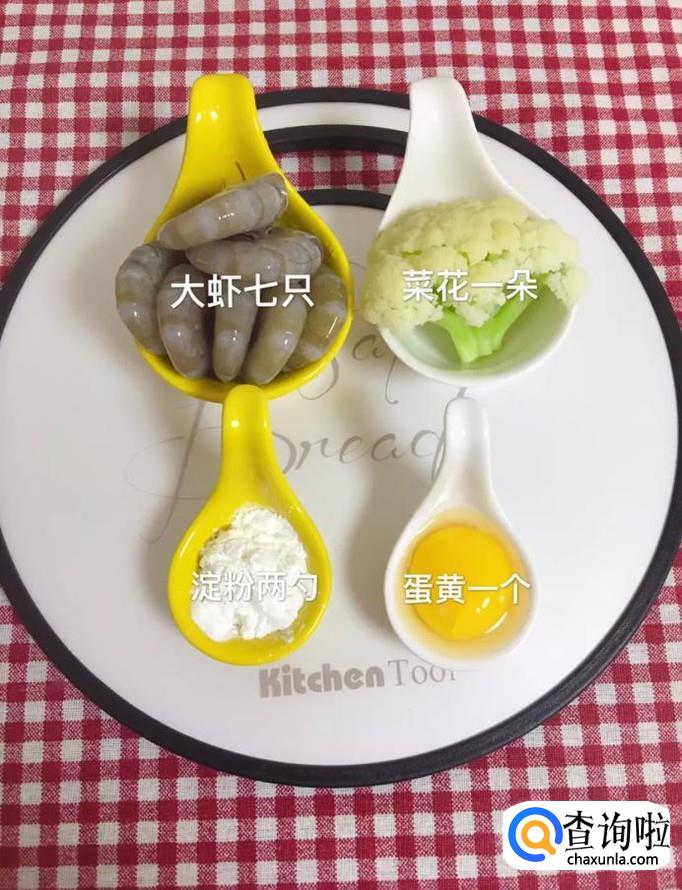 首先准备好所有要用到的食材,如下图所示。小贴士:大虾七只,菜花一朵,玉米淀粉两勺,蛋黄一个。
