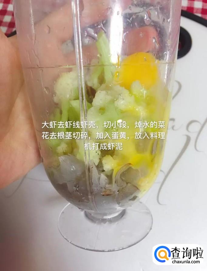 接着将大虾去壳去虾线丢进料理杯,之后放入菜花和鸡蛋,打成泥,如下图所示。