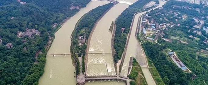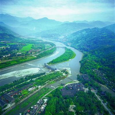 都江堰坐落在成都平原西部的岷江上,由鱼嘴、飞沙堰、宝瓶口等部分组成,科学地解决了江水自动分流、自动排沙、控制进水流量等问题,消除了水患,两千多年来一直发挥着防洪灌溉的作用,使成都平原成为水旱从人、沃野千里的“天府之国”。
