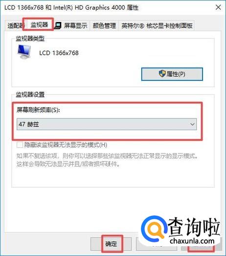 弹出的界面,我们点击监视器,然后我们就可以看到屏幕刷新频率,我们可以点击下拉箭头进行设置,之后我们点击应用,然后我们点击确定就可以了。