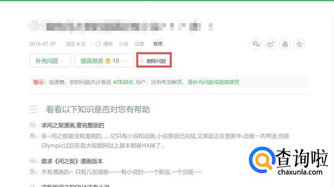 点进去之后,就会出现你的提问所在的界面,点击“删除问题”即可将这条问题删除。