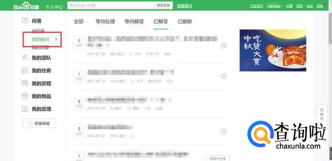 登陆成功后,点击你自己的百度角色名,会出现一个小方框,点击小方框中的“我的提问”。