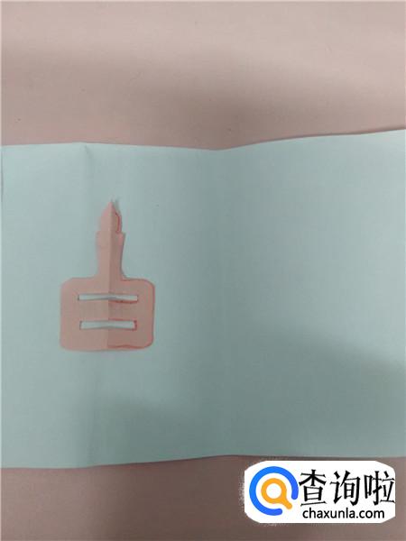 将白纸对折一下,将蛋糕背面抹上胶棒,粘在白纸的左侧。