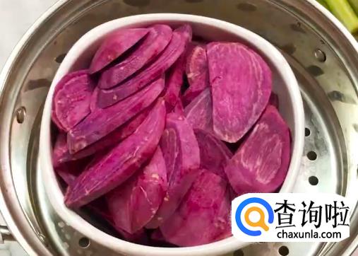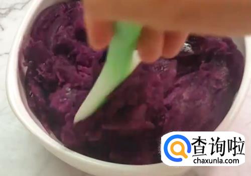 紫薯上锅蒸熟,然后用铲子压扁成泥。