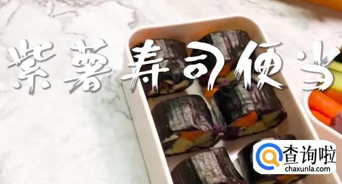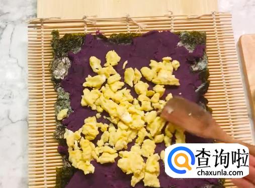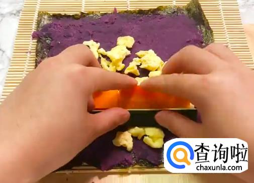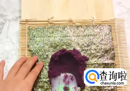 用紫菜铺在卷寿司专用帘子上,抹上紫薯泥,放上蛋花,和胡萝卜条,黄瓜条,然后慢慢将帘子卷起来裹紧。