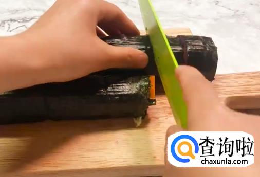 将帘子打开取出卷好的饭团,然后切块盛盘即可。