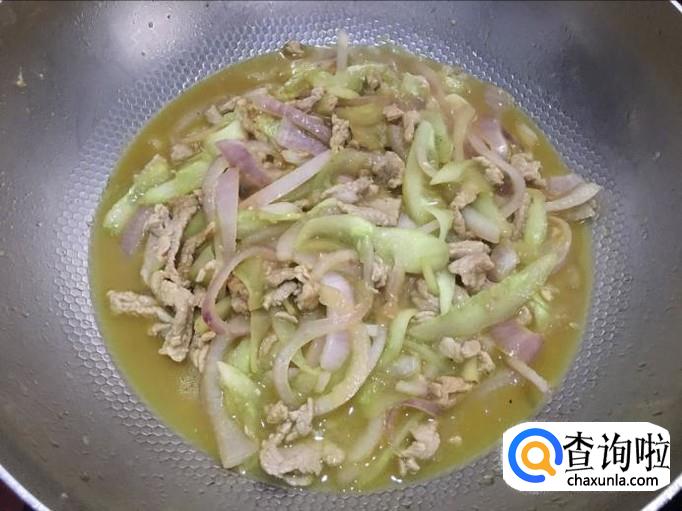 加入黄瓜丝、洋葱丝与肉一起翻炒,加少许水、生抽、盐,翻炒均匀,待肉熟汁收,起锅。