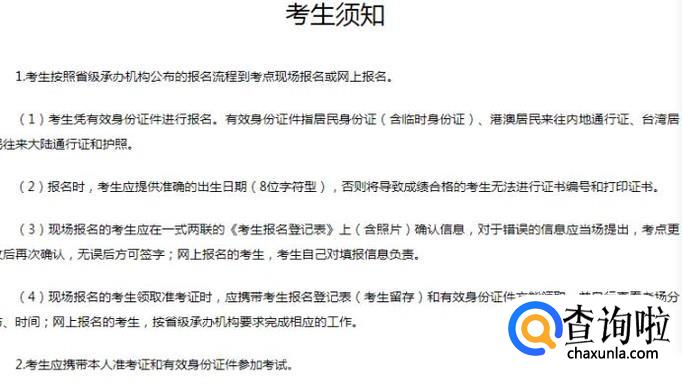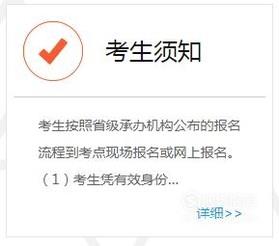 然后点击页面上考生须知,打开可以看到相关考试情况,其中包括网上报名和现场报名两种报名方式。