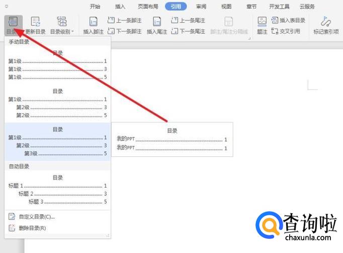 然后点击引用,目录。随便选择一种自动目录即可。这样就设置完成了。