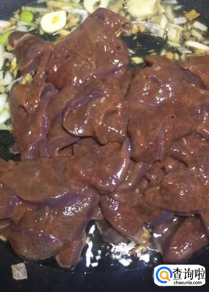 接着我们在锅中放入少许油,油热放入葱姜蒜炒香,放入腌好的猪肝,翻炒均匀