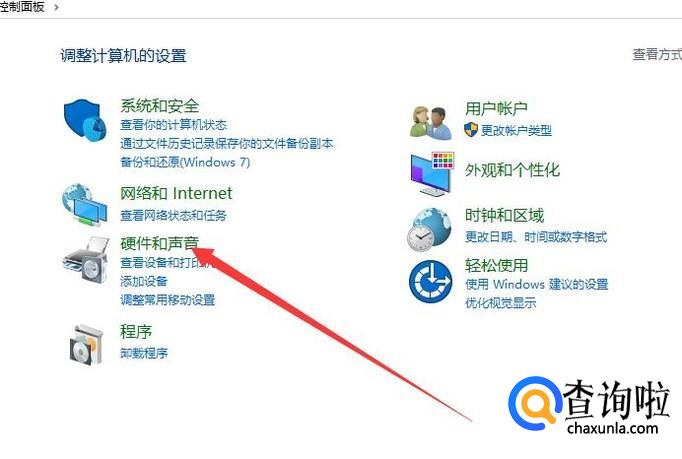 打开电脑,进入到控制面板,点击“硬件和声音”,如图所示。