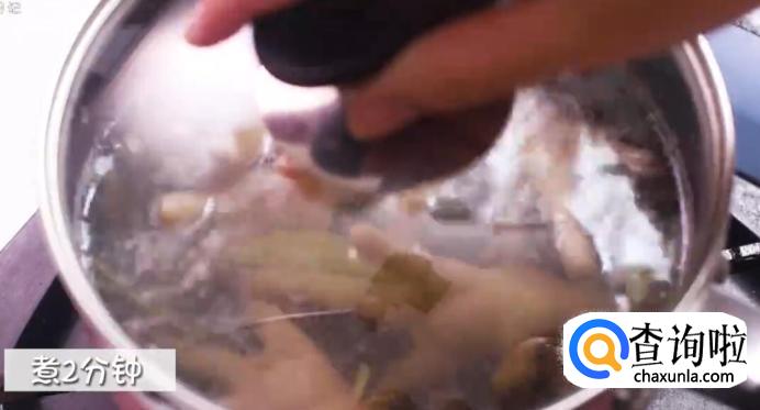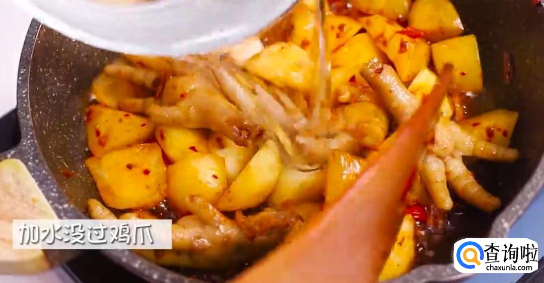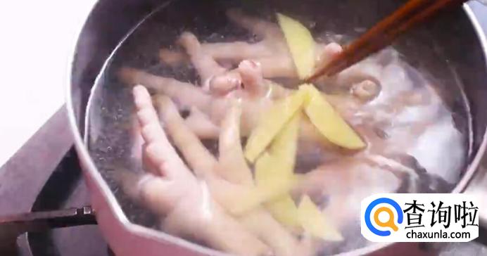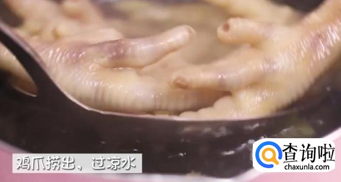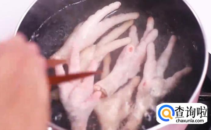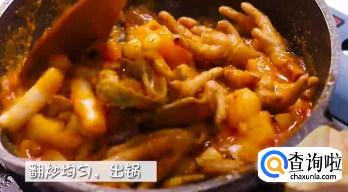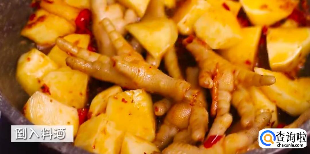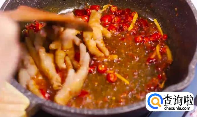 再倒入凉好的鸡爪进行翻炒,直至鸡爪上色。