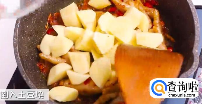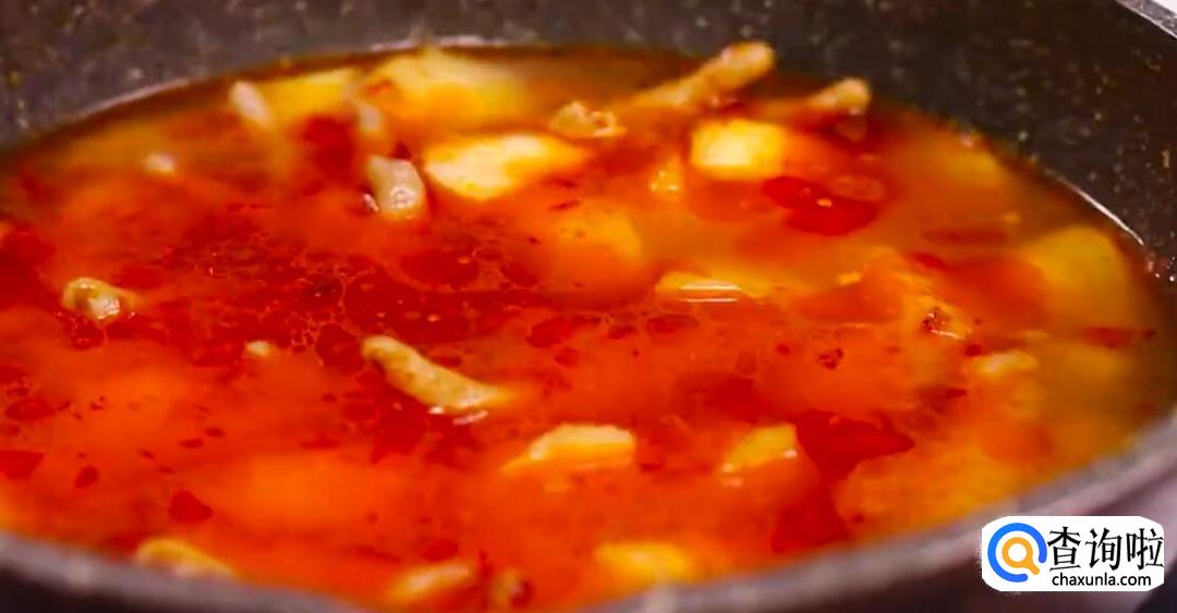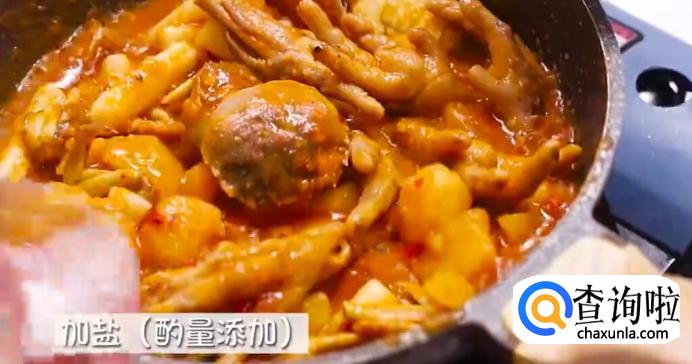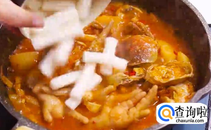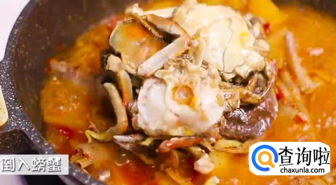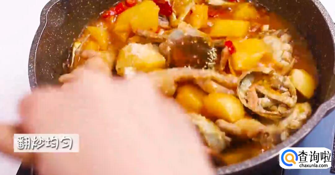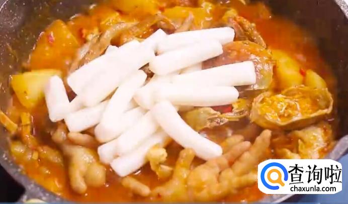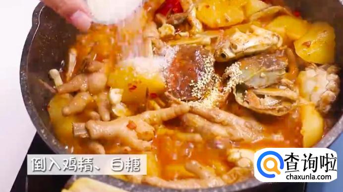 等鸡爪和土豆炖熟之后,倒入螃蟹。